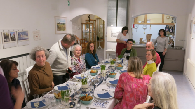 Geschmaust wird an der großen Tafel mitten in der Galerie des mük im ersten Stock. Umgeben von der aktuellen Ausstellung wird Kulinarik zum Kunst- und Gaumengenuss.