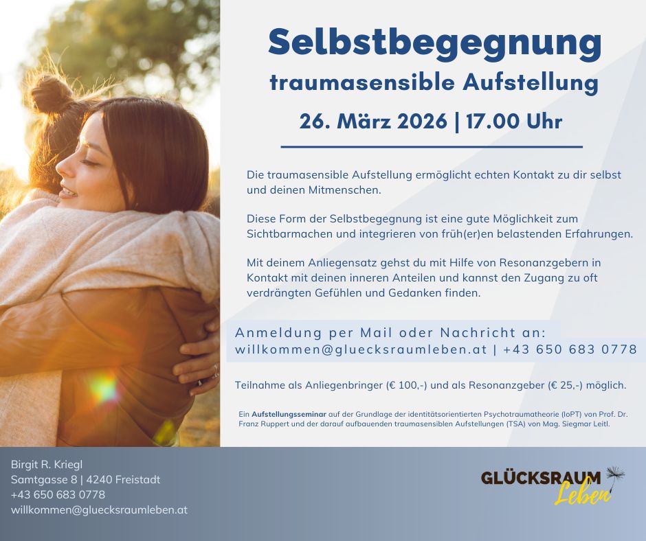 Eine traumasensible Aufstellung kann einen geschützten Raum für eine echte Selbstbegegnung eröffnen. In diesem Rahmen dürfen innere Anteile sichtbar werden, ohne Druck, ohne Bewertung. Schritt für Schritt entsteht Kontakt – achtsam, langsam und in dem Tempo, das sich sicher anfühlt.