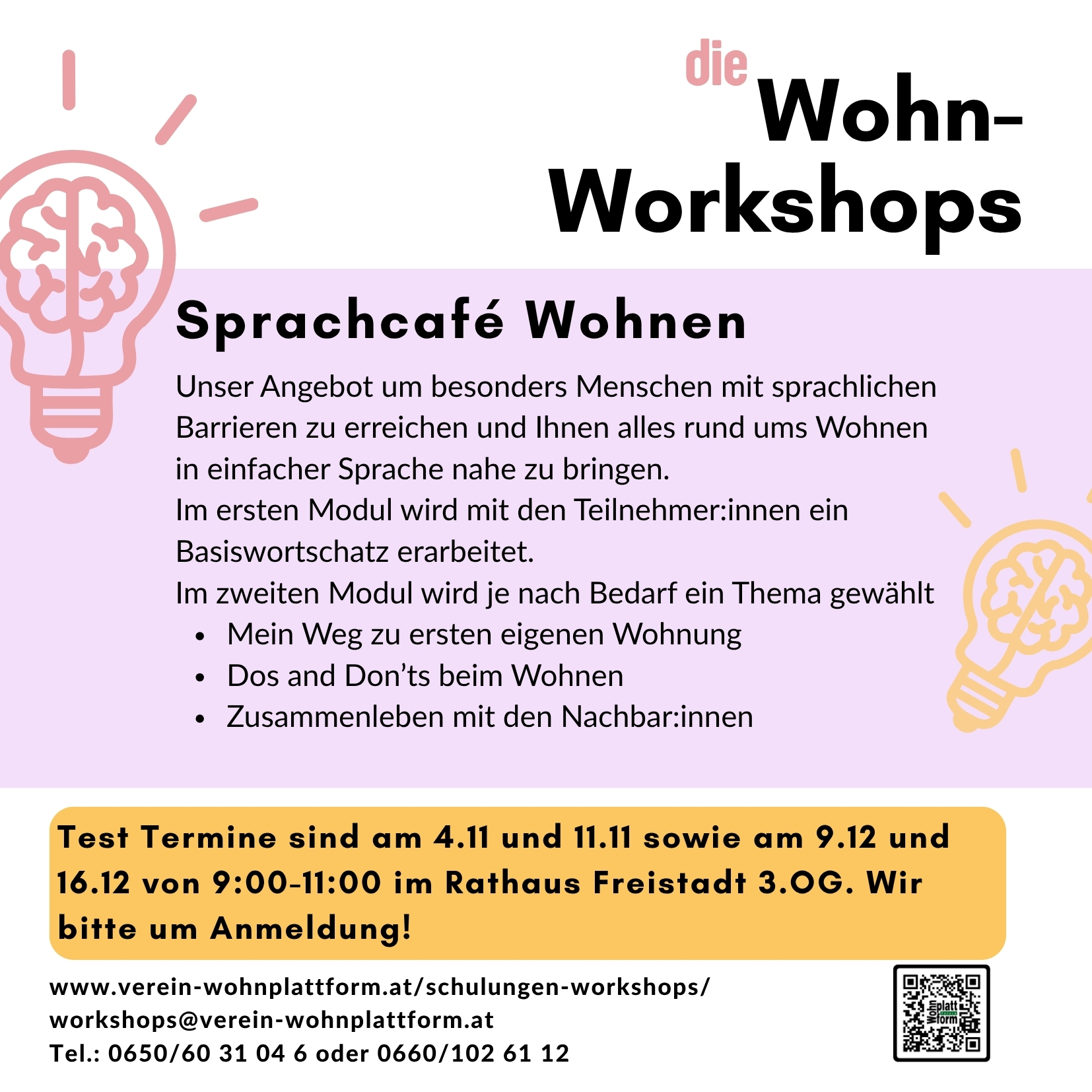Unser Angebot richtet sich an Menschen mit Sprachbarrieren. Wir erarbeiten im ersten Modul einen Basiswortschatz zum Thema Wohnen. Im zweiten Teil besprechen wir wichtige Informationen rund ums Wohnen und Zusammenleben in Oberösterreich. Anmeldung: agn@verein-wohnplattform.at