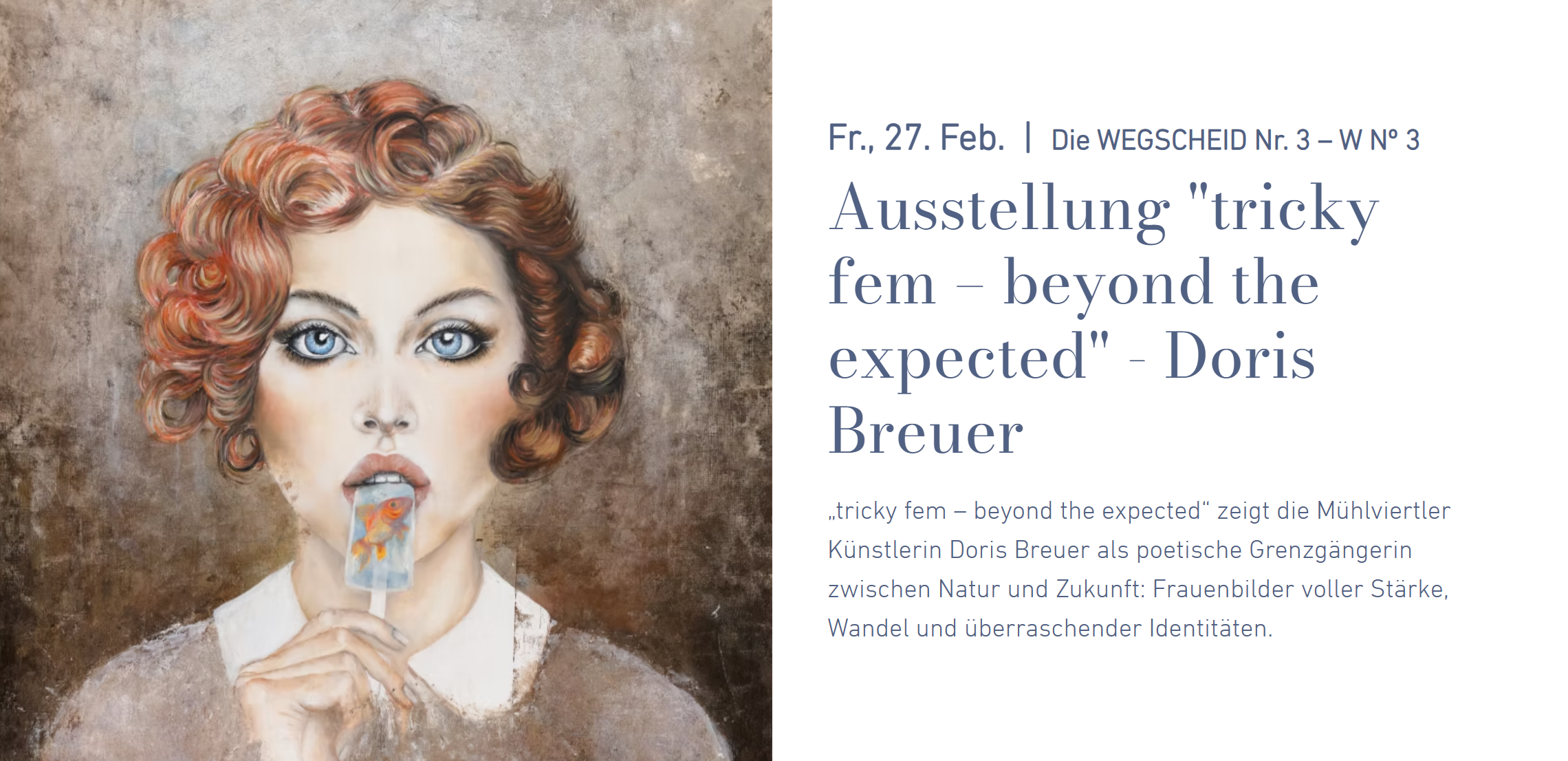 DORIS BREUER ist eine österreichische Künstlerin (*1974). Ihre Malerei orientiert sich hauptsächlich am Realismus, es gibt auch eine Tendenz zum Surrealismus. Die von ihr gemalten Frauen entfalten ihre Möglichkeiten und bringen sie in ihre wahre Identität und Stärke. Ihr Atelier befindet sich in einem alten Bauernhaus am Reitersederhof mit tollem Blick in die Natur. Dort lebt sie zusammen mit ihrer Familie und Freunden.