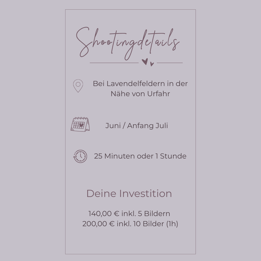 📅 Zeitraum: Juni bis Anfang Juli – ich habe bereits ein paar Termine ins Auge gefasst, alles hängt aber wie immer ein bisschen vom Wetter ab. Deinen genauen Slot besprechen wir dann ganz individuell bei der Buchung.